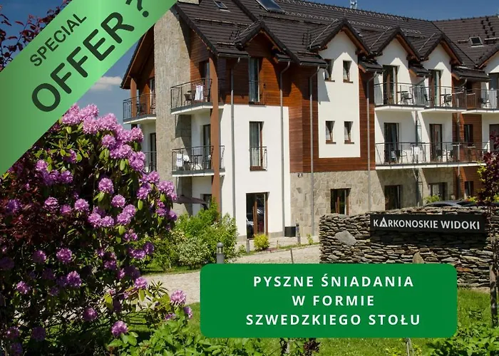 Dotato di un ristorante, l'hotel 3 stelle Karkonoskie Widoki Apartamenty Karpacz si trova a 7 km dal Budowle Świata. Gli ospiti possono godere del giardino di quest'aparthotel, ornato da un barbecue.
